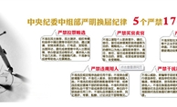 “5個嚴(yán)禁”“17”個不準(zhǔn)”和“5個一律” “5個嚴(yán)禁”:  嚴(yán)禁拉票賄選、嚴(yán)禁買官賣官、嚴(yán)禁跑官要官、嚴(yán)禁違規(guī)用人、嚴(yán)禁干擾換屆“17個不準(zhǔn)”:  1、不準(zhǔn)在民主推薦、民主測評、組織考察和選舉中搞拉票等非組織活動,通過宴請、安排消費(fèi)活動、打電話、發(fā)短信、當(dāng)面拜訪、委托或者授意中間人出面說情、舉辦聯(lián)誼活動等形