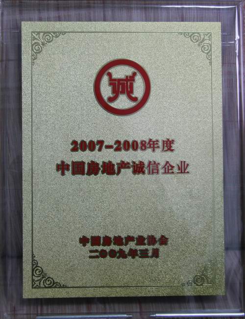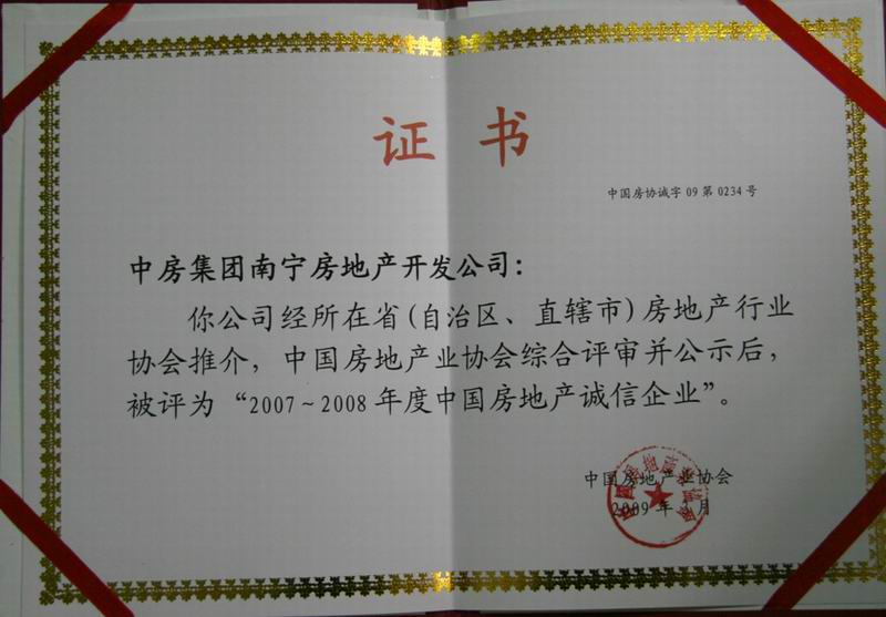 熱烈祝賀中房集團南寧房地產開發(fā)公司榮獲2007-2008年度中國房地產誠信企業(yè)